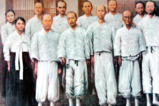 | ▲1945년 8월17일 평양 산정현교회에 모인 출옥 교인들. 뒷줄 왼쪽부터 조수옥 주남선 한상동 이인재 고흥봉 손명복. 앞줄 왼쪽부터 최덕지 이기선 방계선 김인희 오영선 서정환. ⓒ뉴스앤조이 | ||