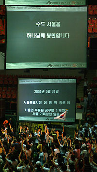 이명박 서울시장 역시 이와 비슷한 일로 곤혹을 치렀다. 이 서울시장은 2004년 5월30일 오후 9시부터 다음날 새벽 4시까지 장충체육관에서 열린 '청년·학생 연합기도회'에 참석해 "대한민국의 수도 서울은 하나님이 다스리시는 거룩한 도시이며, 서울 시민들은 하나님의 백성"이라며 "서울 회복과 부흥을 꿈꾸고 기도하는 서울 기독 청년들의 마음과 정성을 담아 수도 서울을 하나님께 봉헌한다"라는 내용의 봉헌서를 낭독했다.