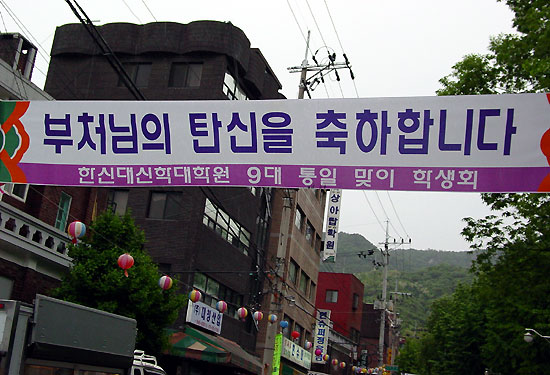 | ▲한신대와 화계사 입구에 걸린 한신대생의 현수막. 서로의 잔치를 축하하는 이들의 행보가 각박한 세상에 흐뭇한 소식이 되고 있다. ⓒ뉴스앤조이 자료사진 | ||