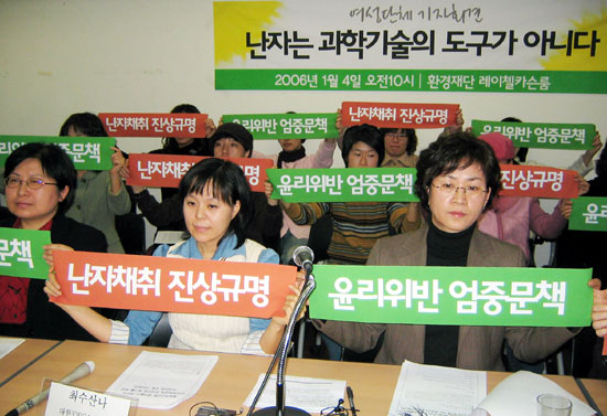 여성들은 “지금까지 황우석 교수 논란의 핵심은 논문의 조작과 배아줄기세포의 존재 여부, 원천기술의 보유 여부에 집중되었을 뿐 난자 사용과 관련한 문제는 부차적인 문제로 치부되어왔다”며 “이는 과학기술의 발전과 국익을 위해서라면 여성의 난자와 몸은 얼마든지 도구로 사용될 수 있다는 반인권적·비윤리적인 태도를 보여주는 것이다”고 지적했다.
