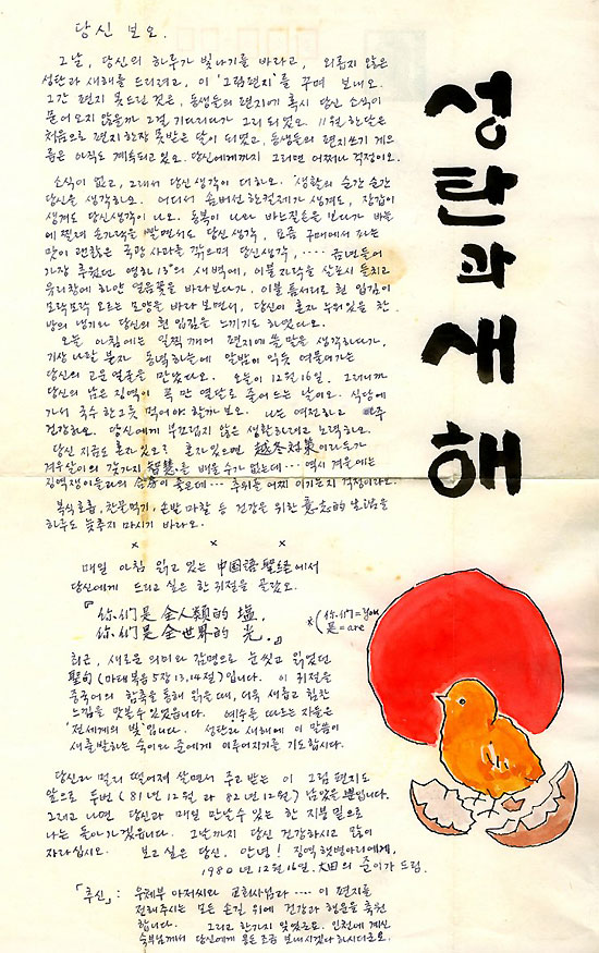 1979년 12월 24일 성탄전야. 내 인생에 차마 잊혀지지 않는 소중하고 고귀한 성탄전야이다. 성탄이 다가오자 나는 더 외로워졌다. 가족과 동지들이 사무치게 그리웠기 때문이다. 나와 같은 외로운 밤을 보내고 잊을 남편이 너무도 보고 싶었다. 난 그리움이 얼마만큼 사람의 마음을 아프게 하는지 새삼 깨달아야만 했다. 지난 시절의 추억들이 주마등처럼 스쳐지나갔다. 목젖이 울컥거리며 애써 참고 있던 눈물이 소리 없이 베개를 적시고 있었다.