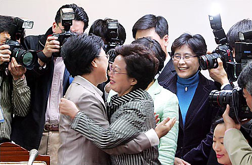 | ▲ 한명숙 의원이 국무총리로 지명된후 열린우리당 김희선 의원과 포옹하고 있다. ⓒ본보제휴사 데일리서프라이즈 박항구 기자 | ||