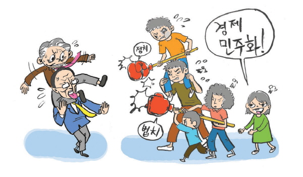 경제민주화를 논하기 위해서는 민주화가 무엇인지 먼저 고민해야 한다. 필자는 민주화란 ‘예외적으로 실현되는 정의가 일상화된 상태’라고 정의한다. 정의가 예외적으로만 작동하는 원인은 독점에서 비롯한다. 예를 들어 보자. ‘당장 저 놈의 목을 치라’는 왕의 한마디에 사람의 목숨이 달려 있던 시대에는 왕의 독재가 일상이었다. 이런 시대에도 가물에 콩 나듯 민주주의의 모습이 나타나기도 했다. 신문고를 두드려 자신의 억울함을 호소하여 문제를 해결한 것과 같이 말이다. 그러나 정치 민주화를 이룬 나라에서는 국민이 일상적으로 여론을 형성하고 정례적인 선거를 통해 자신들의 뜻을 표출한다. 권력은 독점되지 않으며 교체되기도 한다.