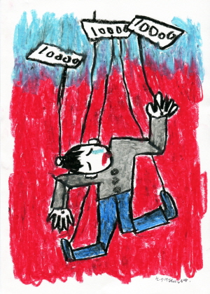 한 가지 예만 더 들어 보자. 은행에서는 돈을 빌릴 수 없어 대부 업체와 사채업자에게 돈을 빌린 수많은 사람들이 자살과 파산의 벼랑으로 내몰리고 있다. 40%에 가까운 이자를 받아 돈놀이를 하는 어느 대부 업체는 고리로 등록금을 빌려 주고 번 막대한 돈의 일부를 대학생 500명에게 장학금으로 준다는 광고를 쉴 새 없이 내보내고 있다.5)