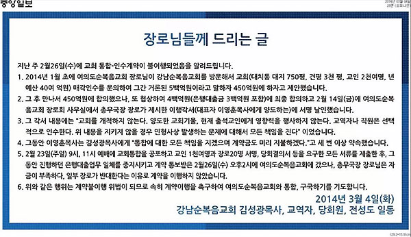 #장면2. 최근 한국 최고 규모인 여의도순복음교회와 강남순복음교회 사이의 매수계약을 둘러싼 진실 공방이 ‘그들끼리’ 뜨겁다. 중앙일보 광고지면을 통한 성명서 발표도 두 차례나 있었다. 내용을 보니 교회 매각 액수로 거론된 돈의 액수가 무려 350~450억 원이다. 이 돈의 75퍼센트는 성도들 머릿수까지 담보한 은행 빚이란다.