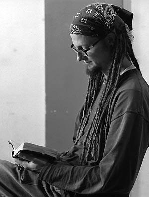 | ▲ 머리에 쓴 두건과 헐렁한 바지, 후드티는 쉐인의 트레이드마크다. Photo by Ms. Tsar Fedorsky(www.redletterchristians.org) | ||