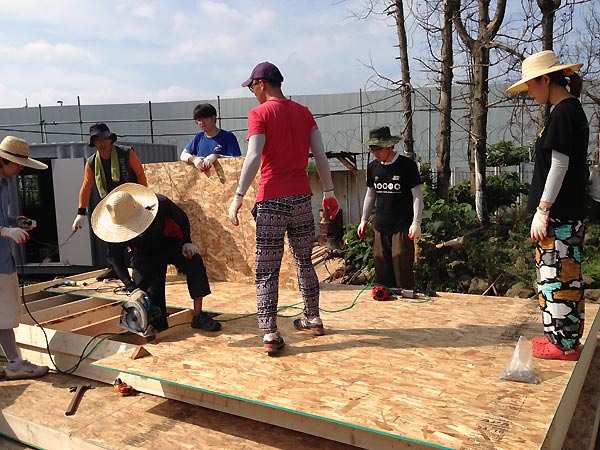 예닐곱 명의 사람들이 한 팀이고, 5일 안에 집을 지어야 한다. 컨테이너로 만들어진 단층집 위에, 2층으로 올릴 경량목구조주택을 짓는 일이다. 집을 짓는다는 것은 이 싸움의 끝을 보겠다는 상징적 의미도 있겠다. 이곳에 장기적으로, 안정적으로 머물면서 평화를 일구어가겠다는 의지의 표현이겠다. 이미 몇 동의 컨테이너로 만든 집들이 주변에 들어서 있었다. 우리가 지어야 할 집도 며칠 후면 이 집들과 연대를 이룰 것이다. 나도 이 집짓기 팀에 합류했다. 아니, 숟가락을 얹었다는 표현이 정확하겠다.