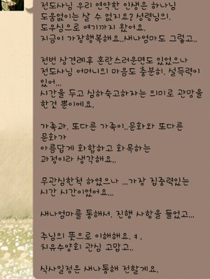 새나: 속상해하셨지만 오래가지 않았다. 여전히 응원해주신다. 특히 엄마가 걱정을 많이 하셨는데 금방 “새나야, 정주가 빚쟁이구나. 아끼고 절약해서 대출 빚부터 갚을 생각해라. 잘 살아야 한다”라고 하시더라. 지금은 괜찮다. 엄마 아빠가 많이 깨어 있으신 분들이다. 나한테도 항상 책 읽고 공부하라고 하시고, 애 태어나기 전에 정주가 더 공부했으면 좋겠다고, 목회를 계속 하려면 더 많은 걸 줄 수 있는 사람이 되어야 하니 지금 더 많이 공부해야 한다고 하신다. 세상도 알고 시대도 알고 공부도 해야 한다고, 가난해도 공부하라고 하신다. 평범한 집이었는데, 부모님도 우리가 결혼하는 과정을 함께 겪으시면서 변하신 것 같다. 상견례 이후 결혼 파토날 지경이었을 때, 두 분이 나 몰래 “시집 못보내겠다”며 싸우시는 걸 들었다. 그러면서도 나한텐 정주와 결혼하게 되면 섬기는 마음으로 살아야 한다고, 쉬운 길이 아닐 거라고 하셨고, 함께 새벽기도를 다니면서 믿음이 회복됐다. 시간이 꽤 지난 뒤 다시 결혼 이야기가 나오고 남편이 아빠한테 식사를 청하는 연락을 드렸을 때, 아빠가 보낸 답신(카톡)에 정말 감동했다.