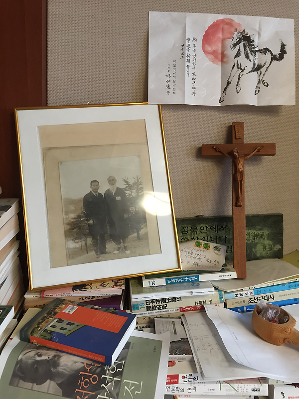 | ▲ 거실 책더미 위 함석헌 선생과 함께 찍은 사진이 놓여 있다. 김삼웅 전 독립기념관장은 "함석헌 선생은 60~70년대 내 사상의 스승이었다"고 말했다. ⓒ복음과상황 오지은 | ||
