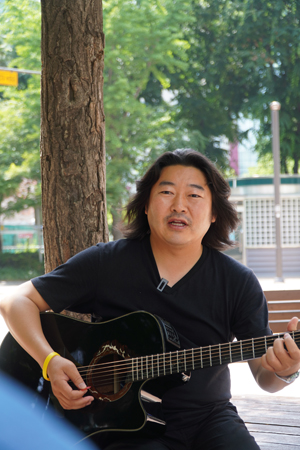 | ▲ "그런데 거리에서 공연을 하다 보니까 힘들고 어려워하는 분들, 특히 피켓을 들고 있는 사람들을 자주 만나게 되었어요. 그분들의 이야기를 들으며 세상에는 억울한 일을 겪은 사람들, 다른 사람들이 주목해주지 않아서 거리에 있는 이들이 많다는 사실을 접했죠. 이분들에게 어떤 도움을 드릴 수 있을까 고민하다가 그곳에서 노래를 했습니다. 평화가 깨진 현장인 성주, 제주 강정마을이나 해고된 노동자들이 모인 현장에서 공연을 자주 하다 보니 그곳의 이야기를 노래로 만들게 되더라고요." ⓒ복음과상황 정민호 | ||