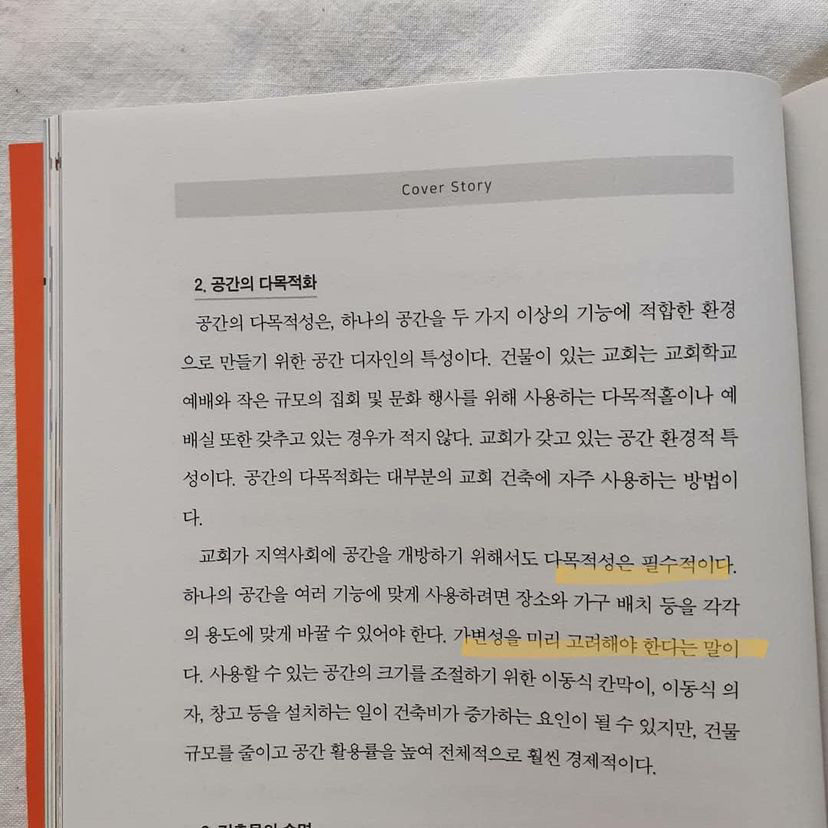 교회라는 공간에 대한 이야기가 더 나왔으면 좋겠다. 어느 순간 커버스토리가 4개로 되면서 약간 빈약해진 느낌이 들어 아쉽다. 많을 때는 '너무 많은 거 아니야?' 이랬던 적이 있어서 할 말이 없지만.. 이번 호를 읽고, 일요일 교회에 가서 교회 천장부터 부엌까지 자세히 살펴보며 그 공간의 의미를 다시 생각해 봐야겠다.