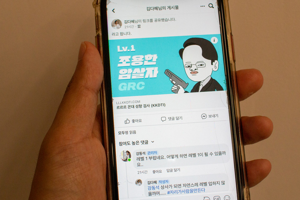 정민호 / 사실 내가 꼰대인지 아닌지는 별로 궁금하지 않다. #no관심 우리 동료들의 유형이 궁금했을 뿐. 왠지는 모르겠는데 내심 다른 이들의 레벨이 높게 나오길 바랐다. 기대치엔 못 미치는 결과를 확인하고 괜히 아쉬워하는 중 #다시해