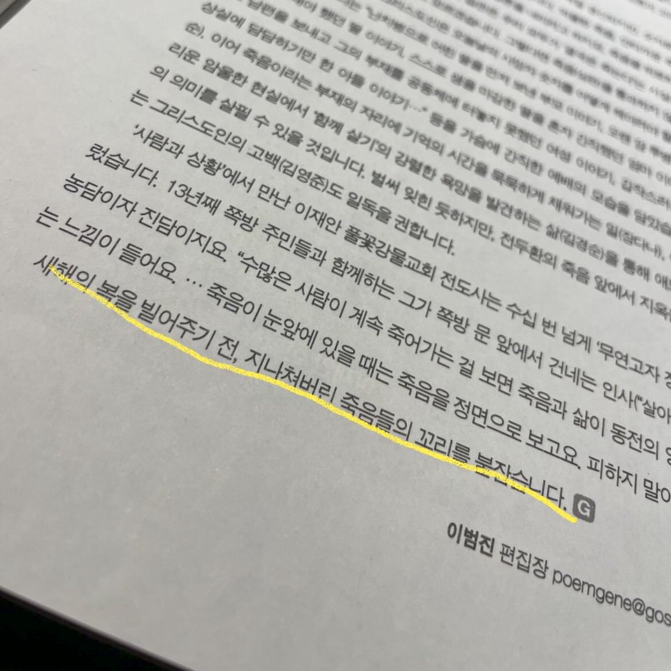 “새해의 복을 빌어주기 전 지나쳐버린 죽음들의 꼬리를 붙잡습니다.”