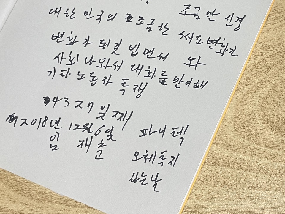 아저씨는 잘 웃고 재밌는 사람이며, 누구보다 투쟁에 진심인 사람이었습니다. 아저씨는 《우리에겐 내일이 있다》에 사인해주시며 “사회 나와서 대화를 만이 해 조금만 신경 써도 변화가 와”라고 적어주셨어요. 변화가 올 것이라는 희망, 희망 있는 사람이 어떤 표정을 가질 수 있는지 아저씨를 통해 보았습니다. 아저씨는 투쟁하는 노동자의 자부심을 자주 보여 주셨습니다. 그 자부심이 단식으로 연결된 게 아닐까요.