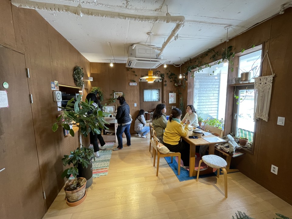 둘째 날은 아무래도 금요일이라, 오전부터 손님이 꽤 있었다. 10시 반쯤엔 이미 네다섯 명의 주민들이 이수진 대표와 함께 큰 테이블에 앉아 있었다. 뜨개질과 관련된 모임인 듯했다. 재능 있는 한 주민을 중심으로 지역 내에서 주민들과 의미 있는 활동을 모색하고 있다.