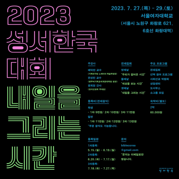 2023 성서한국 대회가 얼마 남지 않은 지금, 저는 이번 성서한국 대회가 정말로 필요한 사람들에게 조심스럽지만 진솔하고 안전한 대화의 장이 되기를, 치열하지만 정의로운 토론과 논쟁이 일어나는 장이 되기를, 무엇보다 따뜻하고 그리운 만남의 장이 되기를 간절히 바라고 있습니다. 이러한 기본에 충실했을 때, 우리 운동의 목표와 역동은 자연스럽게 따라올 것입니다. 녹음이 푸르게 짙을 7월의 캠퍼스에 시원한 그늘과 테이블, 의자, 그리고 향이 좋은 커피를 준비해 놓겠습니다. 성서한국 대회가 깊고 즐거운 대화와 소통의 장이 될 수 있도록 많은 기도와 관심, 후원을 부탁드리겠습니다.
