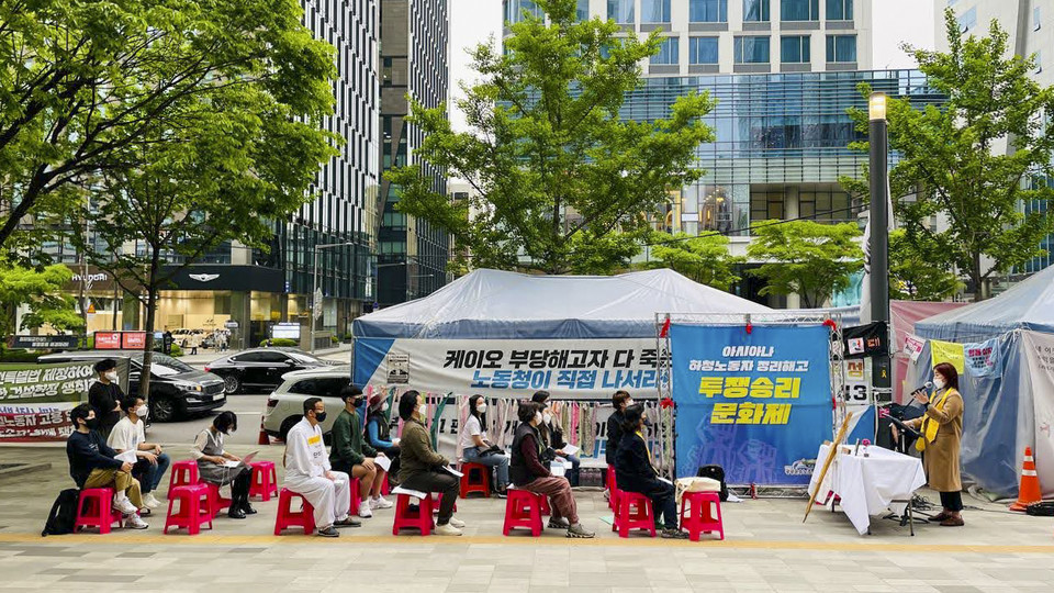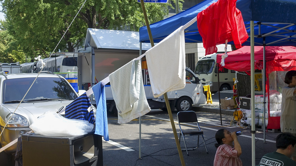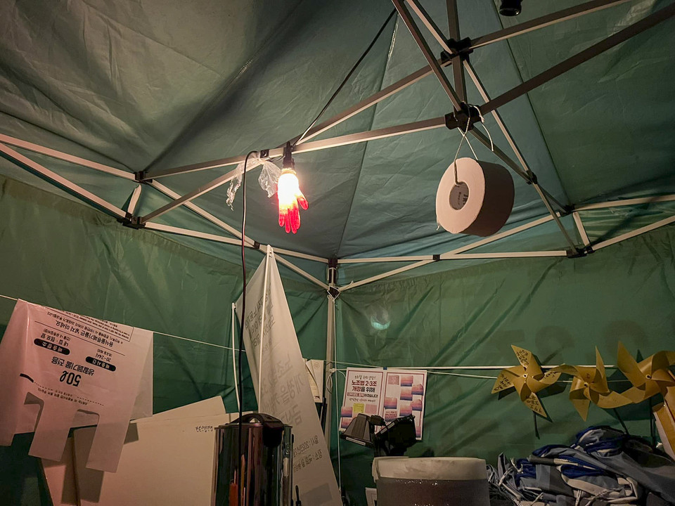 여름의 농성 천막은 덥고 습했습니다. 생수 페트병이 쌓여있었고, 두루마리 휴지도 걸려 있었습니다. 건조하기 위해 널어놓은 수건이 있었고, 벽 한쪽에는 노동조합 일정이 적힌 보드가 있었습니다. 농성 텐트 한구석에는 침구류도 가지런히 정리되어 있었습니다. 밖에서 느꼈던 공포감과는 다르게 나름 질서가 있었습니다. 농성장은 낮에만 운영되지 않고 밤에도 운영됩니다. 언제 닥칠지 모르는 강제집행에 대비해 농성장을 비울 수 없기에 당번을 정해서 천막을 지킵니다. 천막에 누워 잠을 청하면 사람들 발걸음 소리가 굉장히 무섭게 들립니다. 금방이라도 누워있는 나를 향해 찾아올 것만 같은 소리로 들리고, 밤낮 가리지 않는 자동차 소음 때문에 쉽사리 잠들 수 없습니다.