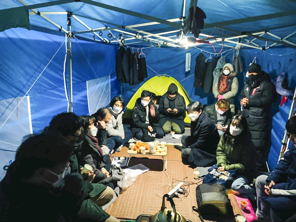 겨울의 농성 천막은 여름보다 조금 더 간결합니다. 추위를 막기 위해 비닐을 여러 겹 쳐서, 들어오는 바람을 막으려 애를 씁니다. 등유 난로를 가져다놓고 밤새 추위를 견디고, 발전기를 돌려 전등과 전기담요를 켭니다. 난로 위 주전자에 물을 끓여 농성 천막에 들어오는 분들에게 따뜻한 차를 대접해 주시기도 합니다. 마음씨 좋은 분들이 보내주신 과일과 커피 믹스로 농성장은 생각보다 풍성했습니다.