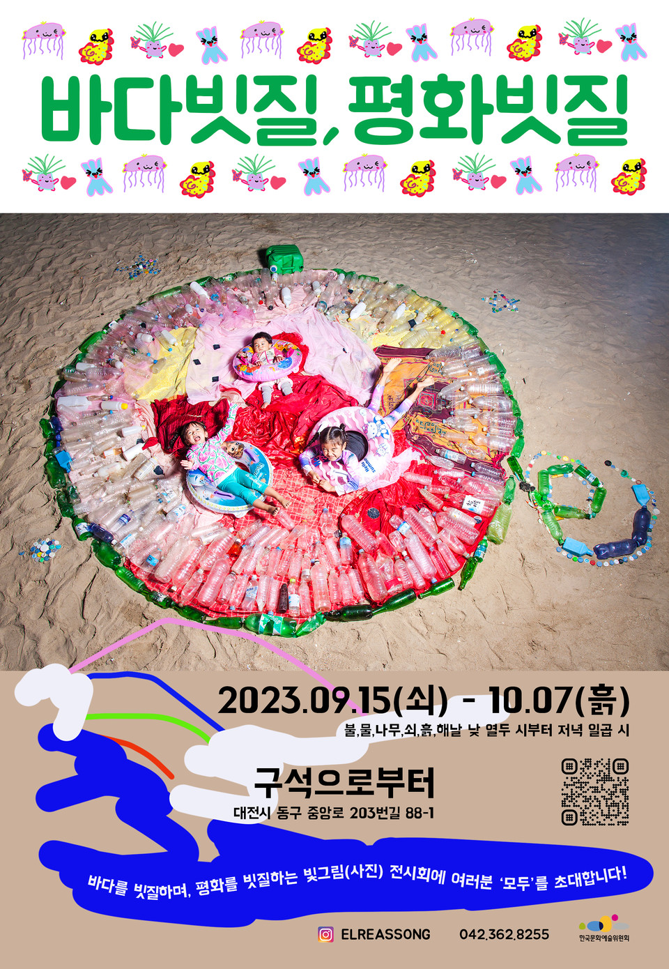 이지연 작가(빗자)는 사진을 통해 이야기를 만들어내는 작업을 해왔다. 코로나 이후 가족 예배를 드리면서 ‘바다빗질’이라는 프로젝트를 시작했다. 주말마다 바다로 가서 해변에 밀려온 쓰레기들을 모으고, 그 속에서 한 장의 이야기를 그리고 찍었다. 그 작품들은 한 편의 동화나 그림처럼 구성됐다. 조카들이 포즈를 취하면, 해변에 있던 쓰레기들이 소품으로 활용되어 하나의 그림을 완성했다.