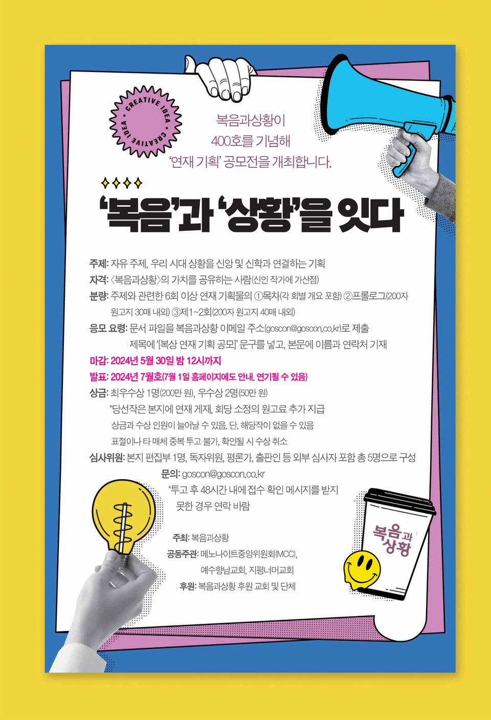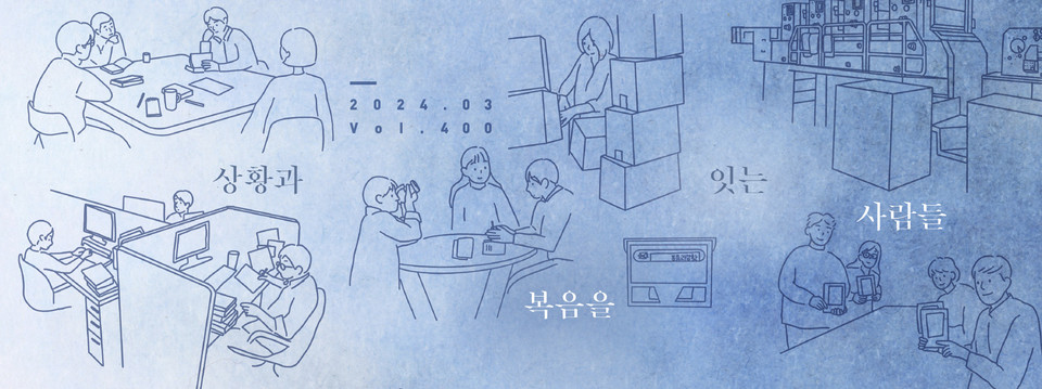 지령 400호에 걸맞은 큰 잔치를 베풀거나 참신한 굿즈를 만들지 못해 아쉽고 송구합니다. 공모전과 뉴스레터 운영에 여력을 모으게 된 마음을 헤아려 주셨으면 좋겠습니다. 이러한 노력들이 이 땅에 복음‘과’ 상황을 잇는 과정이자 결과가 되도록 더 애쓰겠습니다.