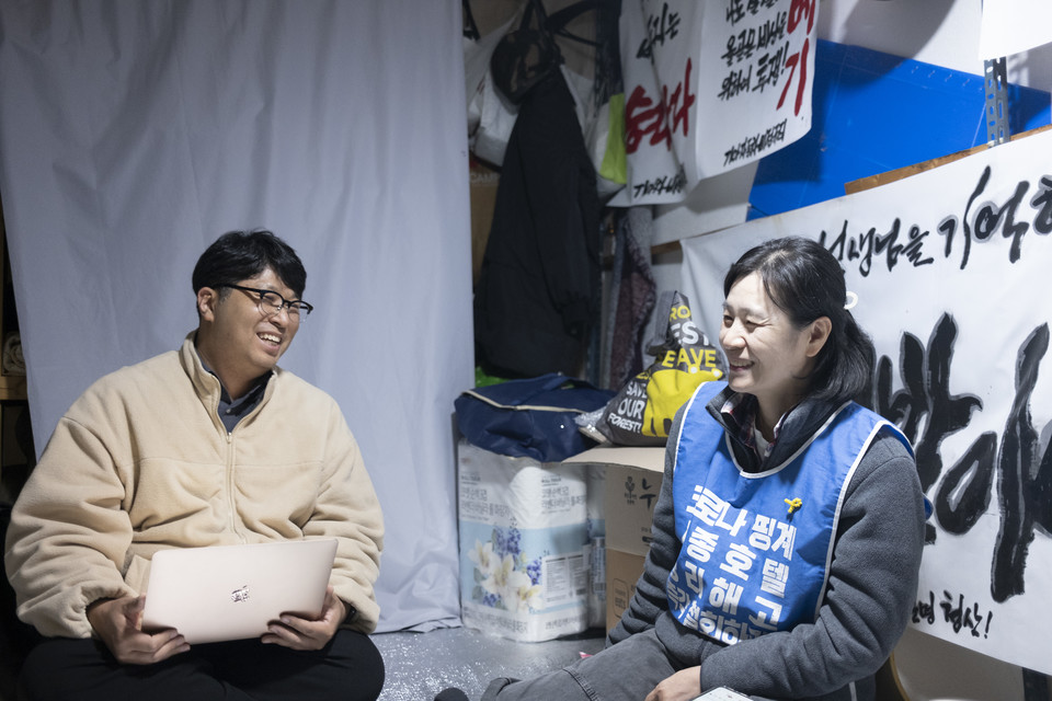 다행히 남편과 가족들은 저의 투쟁을 지지하고 응원해줘서 마음은 편해요. 그런데 너무 오래 시간이 지나다 보니까 마음의 여유가 많이 줄어든 것도 사실이에요. 언젠가는 떠나간 동료들과 내 친구들을 만나고 싶은데 지금 해고자로 있는 상태에서 만나고 싶지 않더라고요. 복직하고 나서 당당히 만나고 싶어요. 해고가 부끄러운 것도 아니고 내가 세상에 진 것도 아니죠. 하지만 이기고 돌아와서 만나고 싶은 마음에 지금은 투쟁하는 사람들 외에는 주변 사람들을 거의 만나지 못하고 있어요. 다 만나서 이야기하고 싶은데 그러지 못해 아쉬워요.