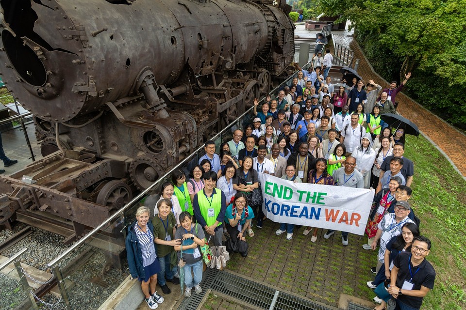 DMZ 순례의 핵심은 남북출입사무소 방문이었다. 북한 땅이 멀리 보이는 도라전망대, 안보 견학의 대표 장소인 제3땅굴에 가지 않고 우리는 남북출입사무소를 견학했다. 개성공단만 하더라도 남측 인원 약 1,000명이 북측에 상주하고, 매일 800여 명이 출입하던 시절이 있었다. 지난 80년 동안 갈라져 오직 적대하기만 한 것이 아니라 서로 교류하고 왕래하였음을 기억하고자 했다. 외국인 참가자들뿐 아니라 국내 참가자들도 교류의 역사를 제대로 알지 못했음을 고백했다. DMZ 순례는 임진각, 오두산 통일전망대 방문으로 이어졌다. 특히 경의선 장단역 증기기관차 앞에서 설명이 끝난 후, 한 외국인 참가자가 “END THE KOREAN WAR”라고 적힌 플래카드를 꺼내 들었다. 분단의 역사가 고스란히 담긴 증기기관차 앞에서 주최 측이 아닌 외국인 참가자가 준비한 플래카드를 두고 함께 단체 사진을 찍으면서 현장에 있던 많은 사람이 깊이 감동하였다.