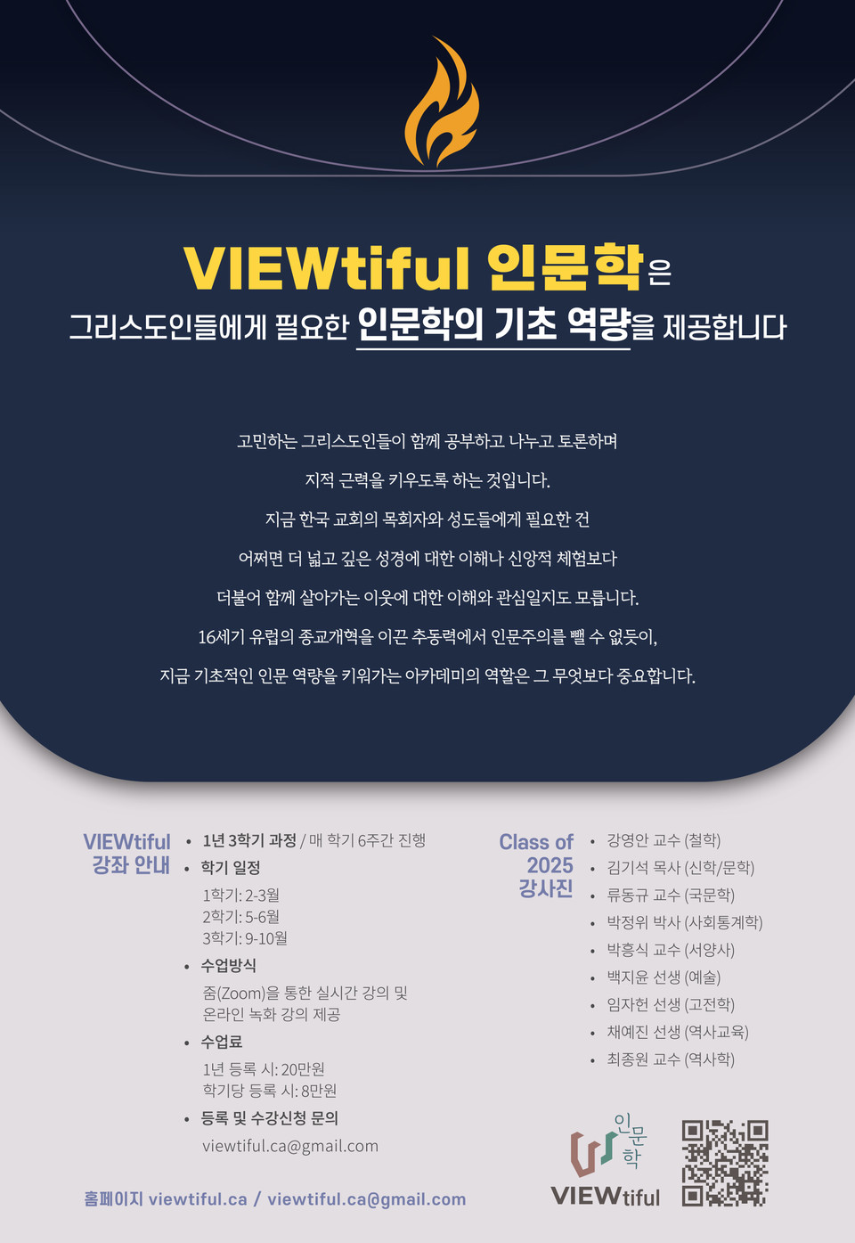 그런 그가 밴쿠버에 있는 동료들과 함께 온라인 인문학 플랫폼 ‘VIEWtiful 인문학’을 시작한다. ‘인문학적 관점(view)을 통해 아름다운(beautiful) 세상을 만들겠다’는 중의적 의미를 담고 있는 VIEWtiful 인문학은, 인문학적 소양을 기를 수 있도록 기초 강의를 제공하는 학습의 장이자, 교회와 사회에서 고민하는 주변인들이 서로 연대할 수 있는 자조 모임의 성격으로 기획됐다. 소셜미디어 소개 글을 보면 “철학, 역사, 문학, 예술 등 다채로운 인문학으로 사람들과 연대하며 그리스도인들의 지적 근력을 키워 나가는 글로벌 온라인 배움터”라고 적혀있다. 멋진 기획이다. 그러나 어디서 많이 본 것 같다. 새롭게 시작하지만 사실 그리 색다르게 보이지 않는 ‘또 하나의’ 온라인 아카데미의 등장일 뿐일까? ‘오호!!!!’ 하는 느낌표 네 개에 곧이어 ‘어허?’ 하는 물음표 하나가 따라붙는 이 시도를 어떻게 바라봐야 할까.