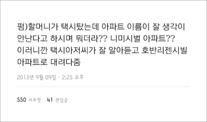 여기에 등장한 기사님은, ‘전설의 고향’을 말했는데 ‘예술의전당’에 내려준 기사님과 함께 택시기사 센스 쌍두마차로 기억되는데요. 이 ‘니미××아파트’ 에피소드는 웃음으로만 그치지 않고, 아파트 이름에 영어를 쓰지 말자는 기사1)에도 등장하며 사회에 경종을 울렸습니다. 인터넷 커뮤니티에서는 ‘Senior Club’이라고 간판을 단 아파트 경로당 사진을 공유하며 ‘작작해라’ ‘누가 알아보냐’ ‘허세작렬’ 등의 많은 분노가 일렁였었고요. 최근 성심당에서는 ‘스트로베리 쇼콜라 케이크’를 ‘딸기시루’로 바꾸어서 매출이 우뚝 솟았다는 모범적인 ‘우리말 사랑’ 기사2)가 있었네요. 괜히 허세 부리지 말고 한글을 아끼고 사랑하자는 교훈(?)으로 글을 마무리하겠습니다. 그나저나 성심당을 두 번이나 썼더니 심상정 사 오고 싶네요. 대전 분들 부럽습니다.