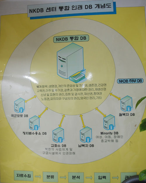 2007년부터 《북한인권백서》를 펴냈으니까 올해 나오는 백서가 벌써 열 번째입니다. 저희들의 활동 역량이 제한되어 있어서 모든 역량을 우선적으로 ‘자료 수집’에 두고 있어요. 한국에 들어오는 사람들에 대한 전수조사가 1차인데 인간의 기억에 의존하는 조사기 때문에 입국 직후(국정원 제외하면 탈북자 전수 조사하는 유일한 기관) 조사하는 데 역량을 집중합니다. 조사 내용을 국제 표준 방식으로 분석하고 인물 파일 및 사건파일도 형성합니다.(데이터베이스의 공정성과 객관성 확보를 위하여 국제적으로 표준화된 인권피해 사례 기록 및 분석 프로그램인 HURIDOCS의 WinEvsys와 Martus를 준용하여 독자적으로 개발한 〈NKDB 통합 인권 DB〉를 사용함-편집자)