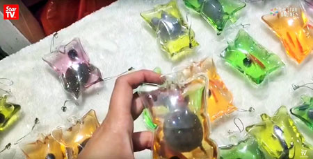 | ▲ 2017년 3월에 보도된 '살아 있는 동물 열쇠고리' 영상. 플라스틱 백 안에 거북이, 물고기, 도마뱀이 산 채로 들어 있다. (유튜브 화면 갈무리) |