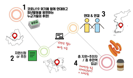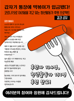 그 경계를 잘 설정하는 것이 저희 세 활동가에게는 가장 큰 숙제였습니다. 프로젝트 이름으로 ‘떡볶이’를 강력하게 밀었던 이유도, 의미 부여가 과하지 않았으면 하는 바람이 담겼기 때문입니다. 그럼 잠시, ‘갑자기 통장에 떡볶이가 입금됐다’(이하 떡볶이 프로젝트)는 이름의 저희 프로젝트가 무엇인지 설명하고 넘어가겠습니다. 떡볶이 프로젝트는 코로나19로 어려움을 겪고 있는 청년 활동가를 후원하는 운동입니다. 저를 포함한 청년들이 좋아하고 평소에 자주 먹을 수 있는 떡볶이를 사먹을 수 있는 정도의 금액이라도 지원해보자는 의미가 담겼습니다.